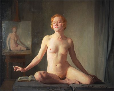 ....og her er hans kone, hende der omtaltes som The Queen Mother og som døde som 100 årig for et par år siden. Det må være malet omkring samme tid.....men så fandt jeg en artikel om "The Newport Nude". Det er billedet blev kaldt siden det vakte furore ved sin visning i Newport i 1947. Selv benævnte Kelly det "DD nude". Initialerne var modellens initialer.