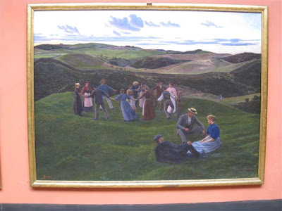 Under en af de allerførste Guldalder-udstillinger der var her - den første Golden Days Festival ? - var Lillemor og jeg på Statens Museum for Kunst og se den store udstilling der. Der var ikke gået mange split-sekunder, så fortalte jeg Lillemor - når vi stod foran de forskellige billeder - detaljeret om dette, dets tilblivelse og om maleren o.s.v. Jeg lagde godt mærke til, at der var mange mennesker til udstillingen. På et tidspunkt opdager jeg, da vi går fra et billede i en sal til næste sal, at der står mange mennesker og kigger på det billede vi lige har forladt og som jeg har snakket om til hende. Lidt senere opdager, da vi er ved at være færdige med udstillingen, at folk har fulgt med. Jeg må have lignet et spørgsmålstegn, for Lillemor griner og fortæller mig, at jeg havde haft hele flokken med rundt "på en lytter". Der er endda nogen, der takker mig "for underholdningen" og endda oplyser, at de troede at jeg var en "officiel guide" på udstillingen, så derfor var de fulgt med rundt.......