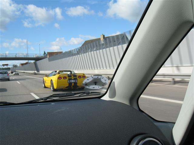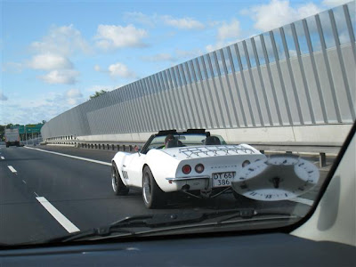 Idag tog Lillemor og jeg afsted til Fyn, d.v.s. Kerteminde og Fyns Hoved. På vej op på motorvejen her i Herlev - på tilkørslen - opdager jeg en sportsvogn, en Corvette. Så opdager vi en til...og en til. Havd sker der lige ? Jeg sænker farten, ser i bak-spejlet og lægger mig ud bag ved den bagerste. Langsomt "cruiser" vi forbi dem.