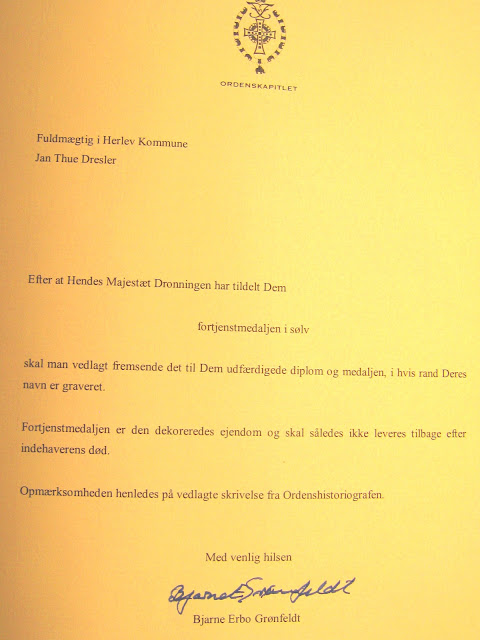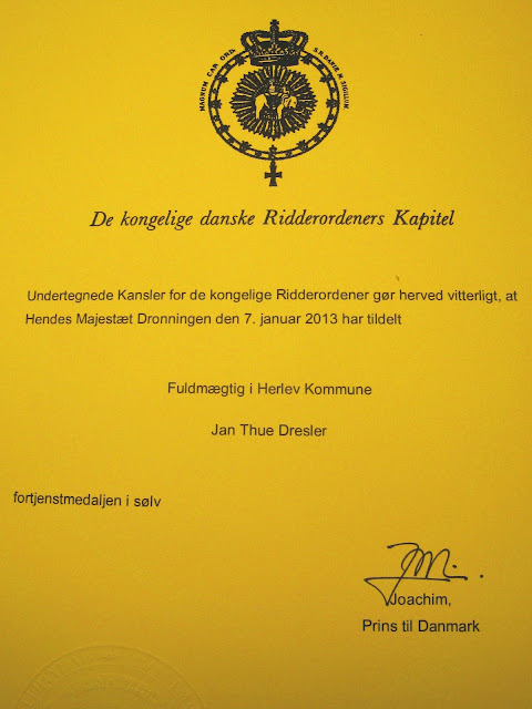 Nåh - men altså d. 1. Februar 2013 er altså idag og idag var jeg så "tilsagt" på Borgmesterkontoret kl. 12,00 til en meget lille ceremoni hvor der kun deltog mig, Borgmesteren og min Forvaltningsdirektør. Det var stille og roligt og her fik jeg så overrakt medaljen med tilhørende papirer: