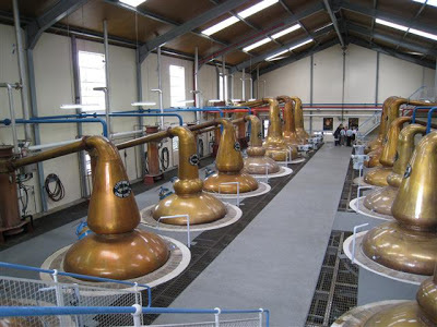 På billedet obvenover ses forskellige kedel-typer og halstyper. De 4 forreste kedler i hver række er wash-stills = 1.destillation, og de 3 bagerste i samme rækker er spirits-stills er 2.destillation.