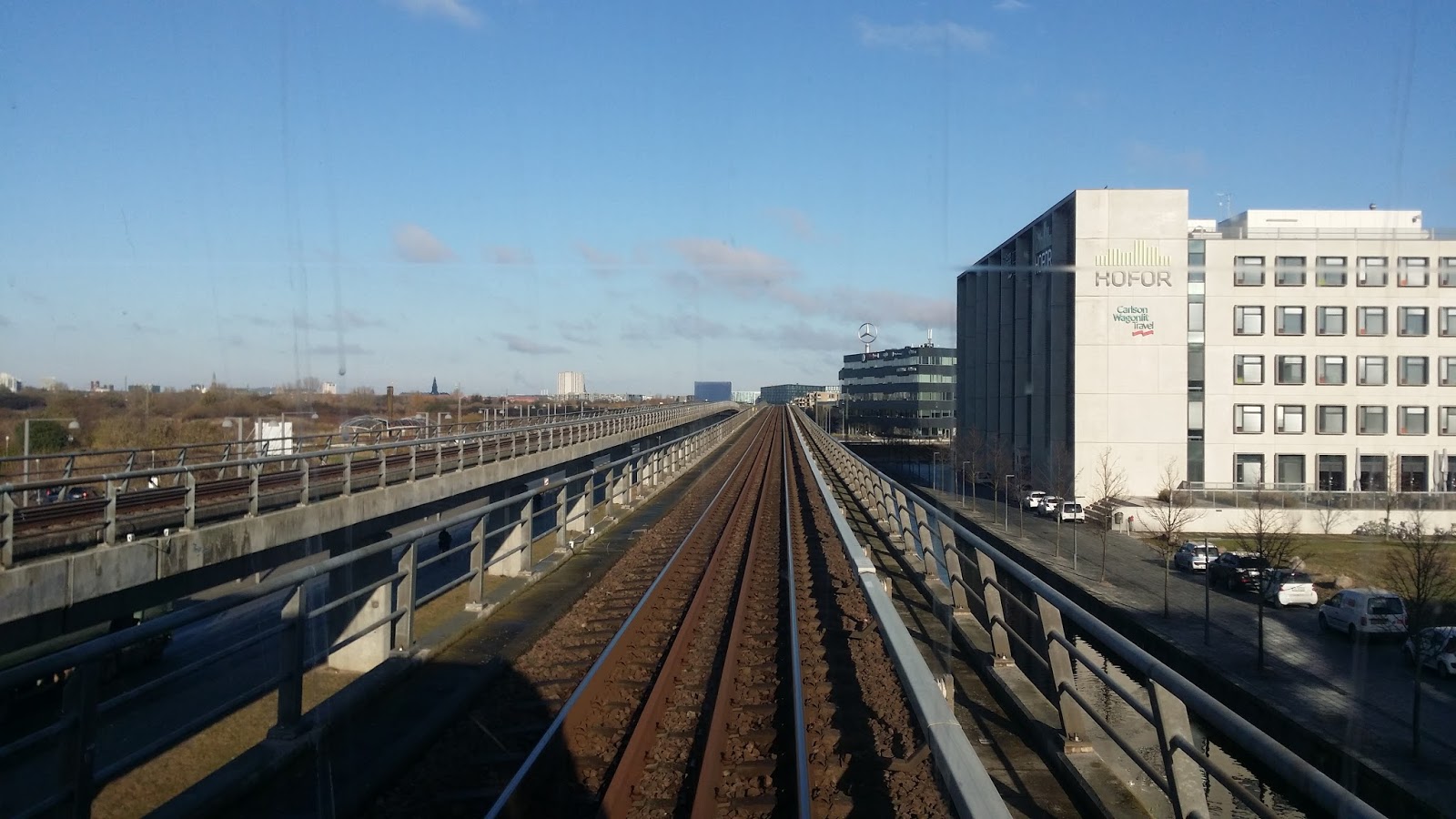 Det andet er ad sporet mod DR-Byen og DR's Koncerthus. Sidstnævnte er den lille blå firkant ca. midt i billedet. Metroen er "ovenjords" ind til Islands Brygge stationen.