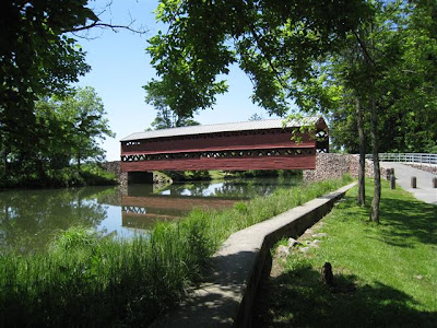 Nåh - der er også andre ting at se på. Faktiskt er landskabet meget flot. Og hvis I kender filmen med Meryl Streep og Clint Eastwood "Broerne i Madison County", så vil I kunne nikke genkendende til sådan en bro som den nedenfor. Det er en overdækket træ-bro fra 1848 ved navn "Sach's Bridge". Sydstaterne gik over/igennem den på vej til slaget og brugte den igen til at slippe væk efter slaget og det undrer stadig folk at de - sydstaterne - ikke nåede at få den brændt af, for Nordstaterne anvendte den også i deres forfølgelse af sydstaterne efter slaget.