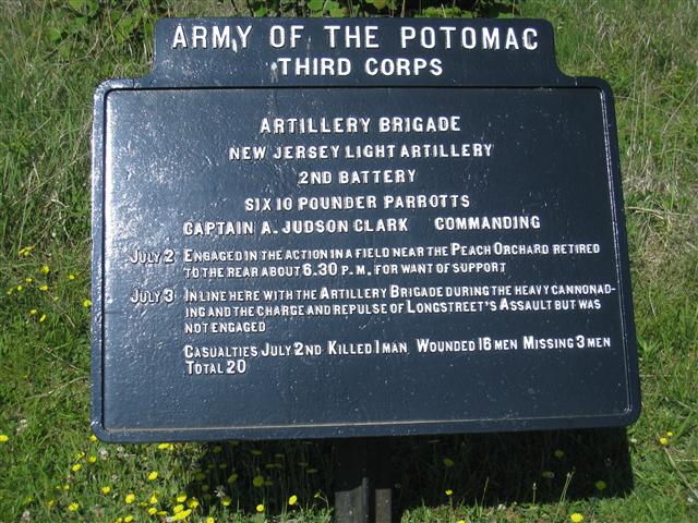 Der er ca. 370 kanoner opstillet rundt på hele slagmarken......og jeg tror jeg fik set dem alle sammen og læst om dem på f.eks. opstilledes skilte (lavet af omstøbte bronce-kanoner). På billedet nedenunder ses at de kanoner der var lige der, var fra Army of the Potomac (Nordstaterne) 3. Korps' Artilleribrigades 2.Batteri fra New Jersey lette Artilleri (regiment) og at det batteri - kommanderet af kaptajn A.Judson Clark - bestod af 6 stk. 10 Pdr. (Kalibren) Parrott kanoner og at det deltog den 2 dag af slaget og at det havde 1 dræbt, 16 sårede og 3 savnede mand, ialt et tabstal på 20. (3.dag var det til stede men deltog ikke). Sådanne tavler er der overalt.