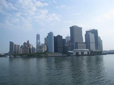 Vi var selvfølgelig også på Manhattans sydspids - Battery Park - hvor man kan se ud til Friheds Gudinden og Ellis Island. Her tog vi færgen over til Staten Island - en gratis færge for byen New York der forbinder disse 2 bydele. New York består af 5 by-dele, nemlig Manhattan, Bronx, Queens, Brooklyn og Staten Island. Herunder ses Sky-line fra færgen af: