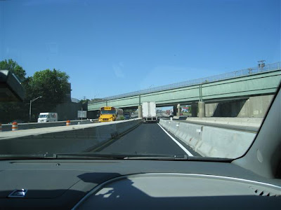 Vi landede i Newark hvor vi i Lufthavnen afhentede vores bil, en Chevrolet Malibu (Mercedes-størrelse) med automatgear forståes. Turen fra Newark (beliggende i New Jersey) og til Gettysburg var på ca. 300 km og tog godt og vel 4 timer. Til forskel fra turen i 2010, hvor vi kørte fra Gettysburg til Buffalo = ca. 700 km, oplevede vi kørslen på motorvejen helt anderledes. Nu var bilisterne meget mere agressive; især de store - og de ER store - lastbiler kørte som om de ejede vejen. Hastighedsgrænsen er max. 65 miles i timen og vi blev tit overhalet af disse kæmpe lastvognstog og det var ret så ubehageligt. Billedet herunder viser kørslen ud fra Newark hvor der var vejarbejde og her klaredes det ved at man havde sat beton-klodser op som kørebane-adskillelse.