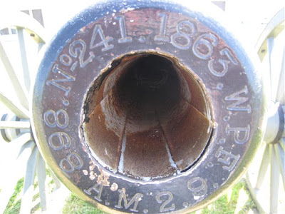 Nu kan de 3 oftest anvendte kanontyper - hver type for sig selv - jo minde om hinanden (en kanon er jo bare en kanon som de andre), men her kommer Nørden (og det er mig) ind i billedet. Nedenfor ses mundingen af en type 3-inch Ordnance Rifle (selvom der står 2,9). Af stemplerne her ses - fra ur-vis kl. 13 af - fabrikationsåret 1863, at den er godkendt af en våbeninspektør med initialerne W.P.F., at dens kaliber er 2.9 (=3 inch), at den er støbt af Ames Manufacturing Co. i Springfielse (A.M.), at den vejer 898 pound (ca. 450 kg) og at den har løbenr. 241.