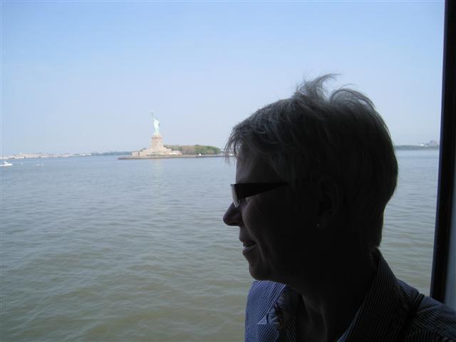 Frihedsgudinden er ret imponerende....og stor. Man kan med turbåde sejle ud til hende og til Ellis Island, men vi valgte bare turen forbi med den ordinære færge.