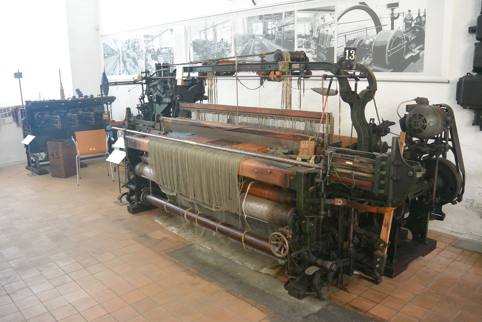 Herfra gik jeg så hen til museet "Slevigske Vognsamling", som hørte til i en gammel industribygning, som havde været brugt til væveri. Indenfor var der stadig enkelte bevarede væve-maskiner (som ses på billedet herunder) ligesom der også sås de her gamle drivbånd hist og her. Jeg var igen første gæst, det vil sige, at jeg var der ca. 15 minutter før åbningstid. Den eneste ansatte - en frivillig - kom ud og satte sig, da jeg kom, for at nyde vejret i skyggen. Vi faldt i snak om bl.a. det her med Haderslev Museers sene åbningstider, kl. 13,00 uanset om det var hverdage eller søn- og helligdage.
