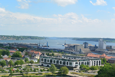 Der var en særudstilling om Prins Henriks asiatiske jadefigurer. Den gad vi ikke se. Vi så den permanente udstilling og den var flot og belærende og berigende. Vi endte rundturen oppe på Tårnets top og sikke en udsigt der er der oppe fra. Billedet herunder viser ud af Kolding Fjord.