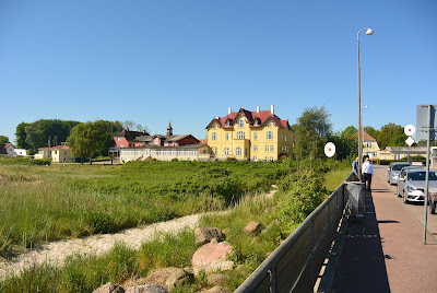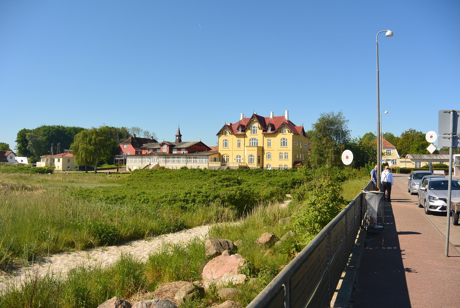 Der ligger en lille havn der og et flot gammelt Badehotel der.