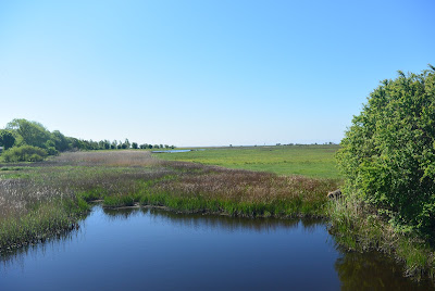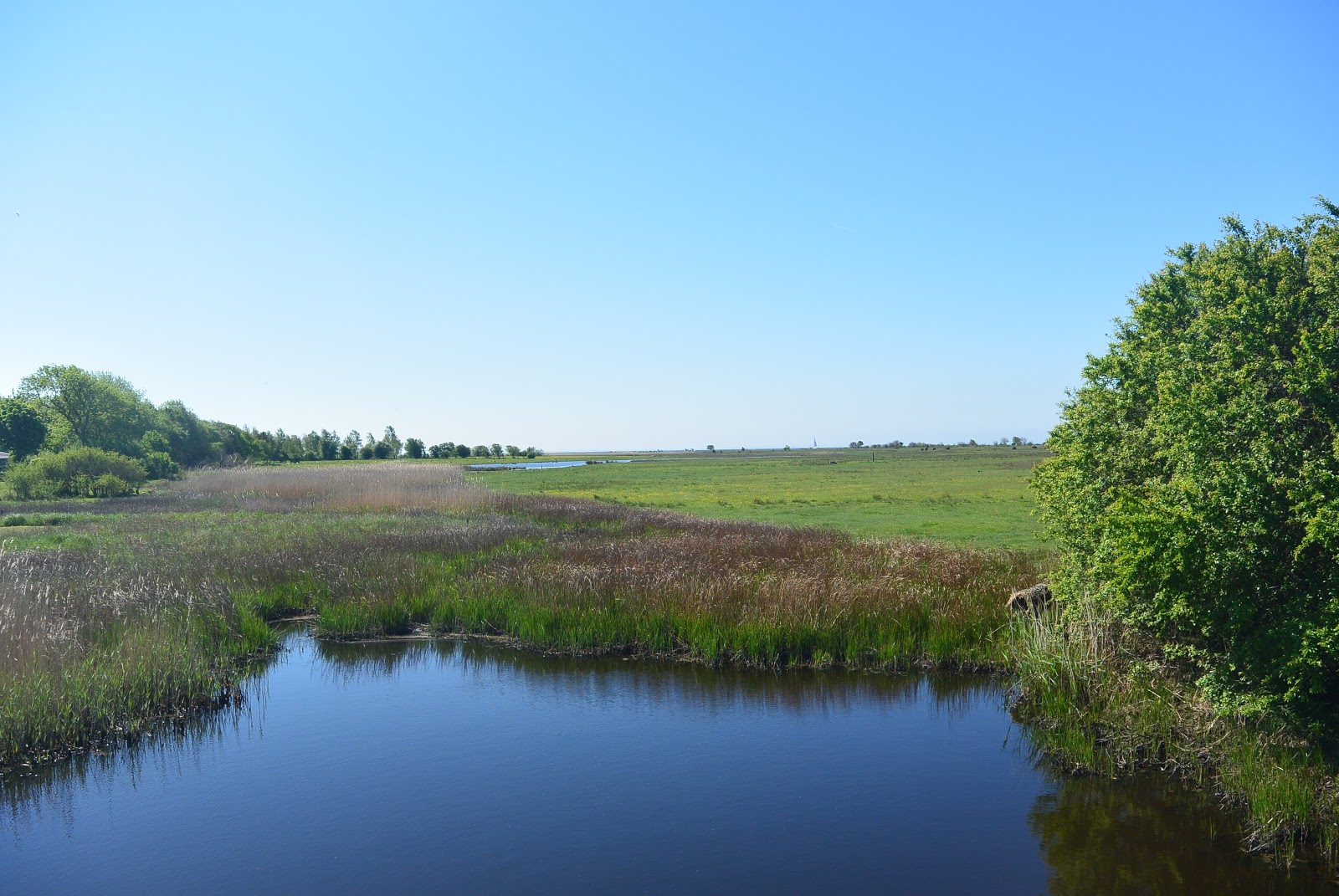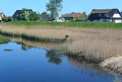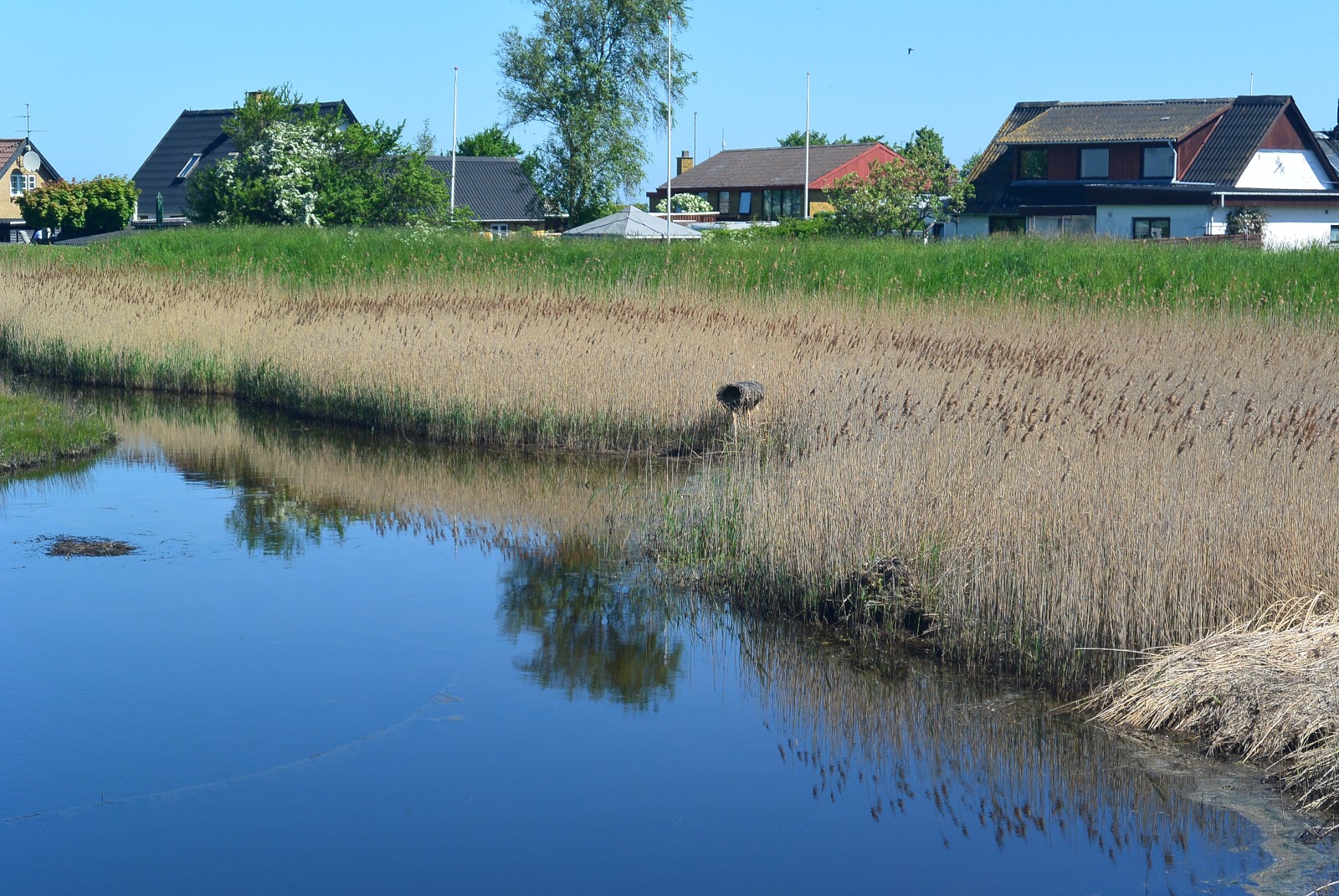 Herover ses ud mod strandengene. Herunder ses midt i billedet et lille flettet sivrørs-rør stående på en pæl. Jeg tør vædde en kop kaffe på, at det er en Hvinands-rede der er opsat der. Der var et par stykker af dem hist og her. Hvinanden yngler gerne i træ-redekasser og/eller gamle udhulede træstammer.