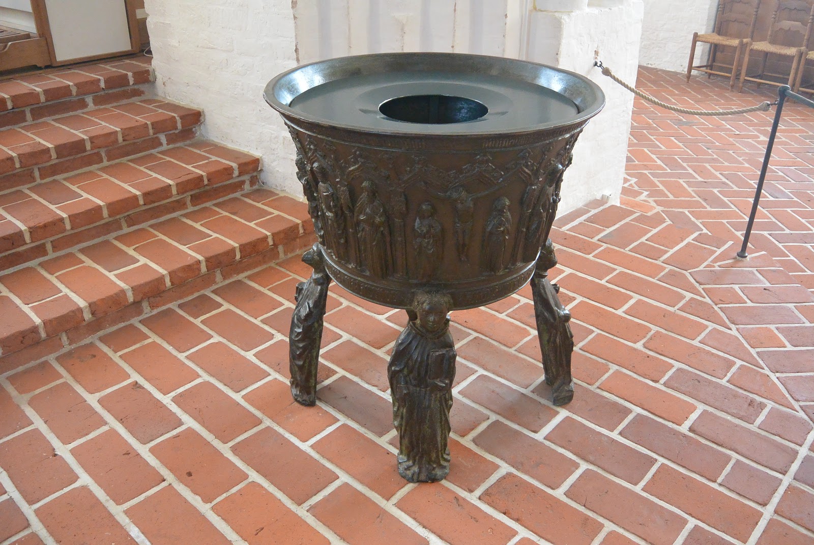 Lidt bemærkelsesværdigt var det, at Døbefonten var af støbe-jern. Det har jeg aldrig set før. Jeg har set døbefonte af granit (det er de fleste gamle), af sølv, af træ med sølvfad og på Island af Lava-sten, men aldrig en døbefont af støbe-jern.