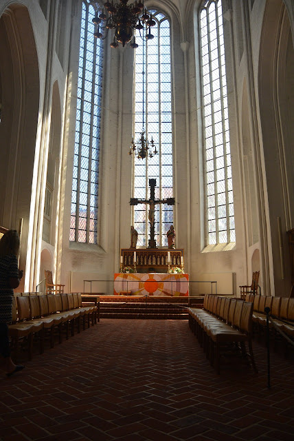 Høj-gotisk at se på indeni. Lidt få kalkmalerier var der. Herunder mod alteret. Jeg tror at alterdugen er lavet af Dronning Margrethe. Jeg synes jeg kunne genkende hendes stil.