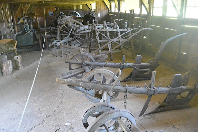 Herinde stod en masse gamle mark-redskaber herunder forskellige plove: