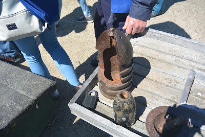 Kl. 11,45 var der kanon og granat- kugledemonstration af samme unge mand som ved geværerne. Jeg har set det før, men denne gang blev der gjort noget ud af med hensyn til gennemgang af de forskellige kanontyper (glatborede og riflet) samt bagladere (de preussiske) og forladere (de danske) samt ikke mindst de forskellige kugle- og granatyper samt ikke mindst hvordan en "brandrør" (tændsats) på en kugle-/granat virker.....og som amerikansk borgerkrigs artilleri nørd var det jo lige noget for mig (selvom jeg nok vidste mere om det end den unge mand). Herunder ses nogen af de anvendte kugler og granatyper: