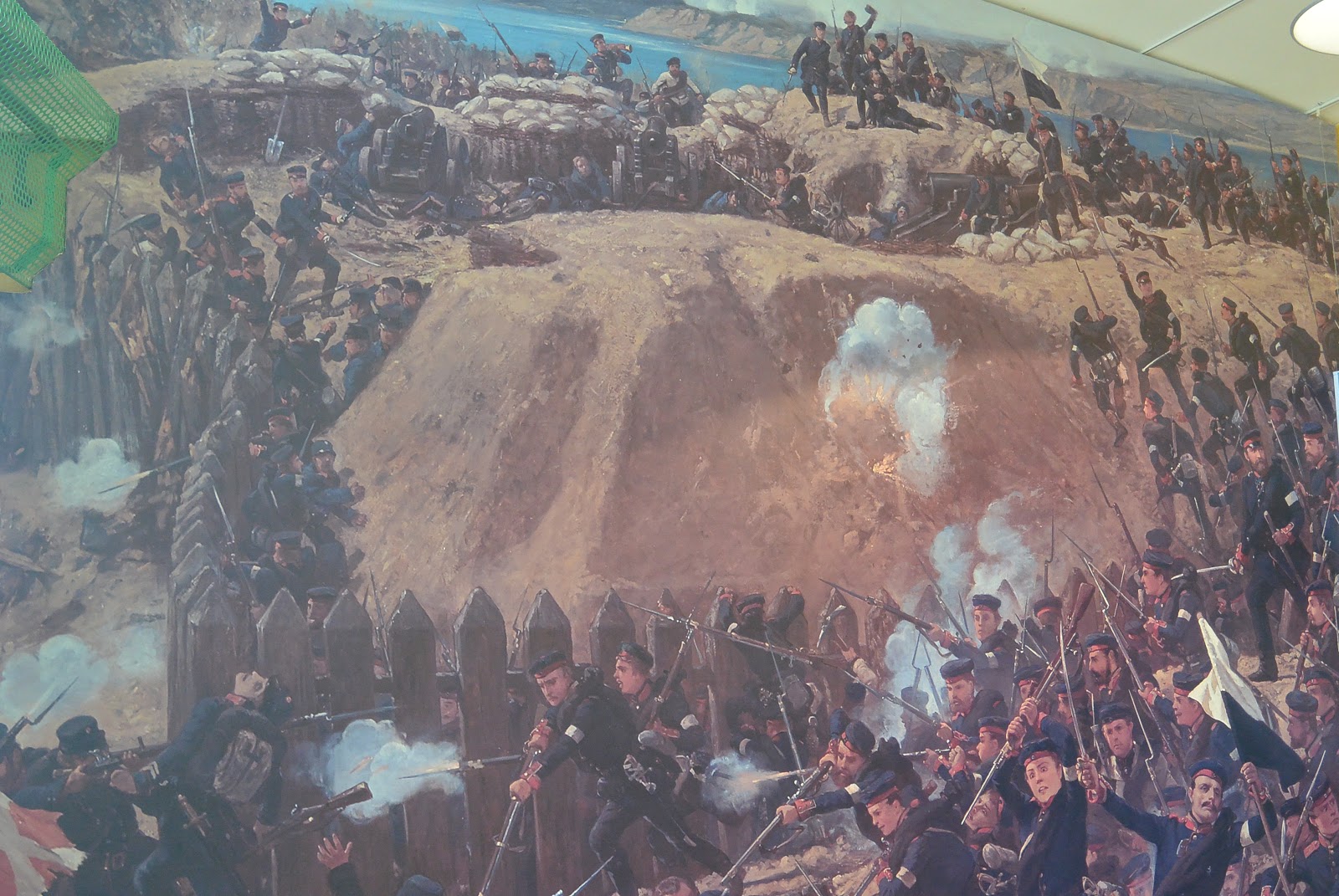 Herover 2 fotos af til venstre en dansk 1864 soldat og til højre en preussisk 1864 soldat. På en endevæg indenfor var der et gevaldigt maleri af stormen på skanserne.