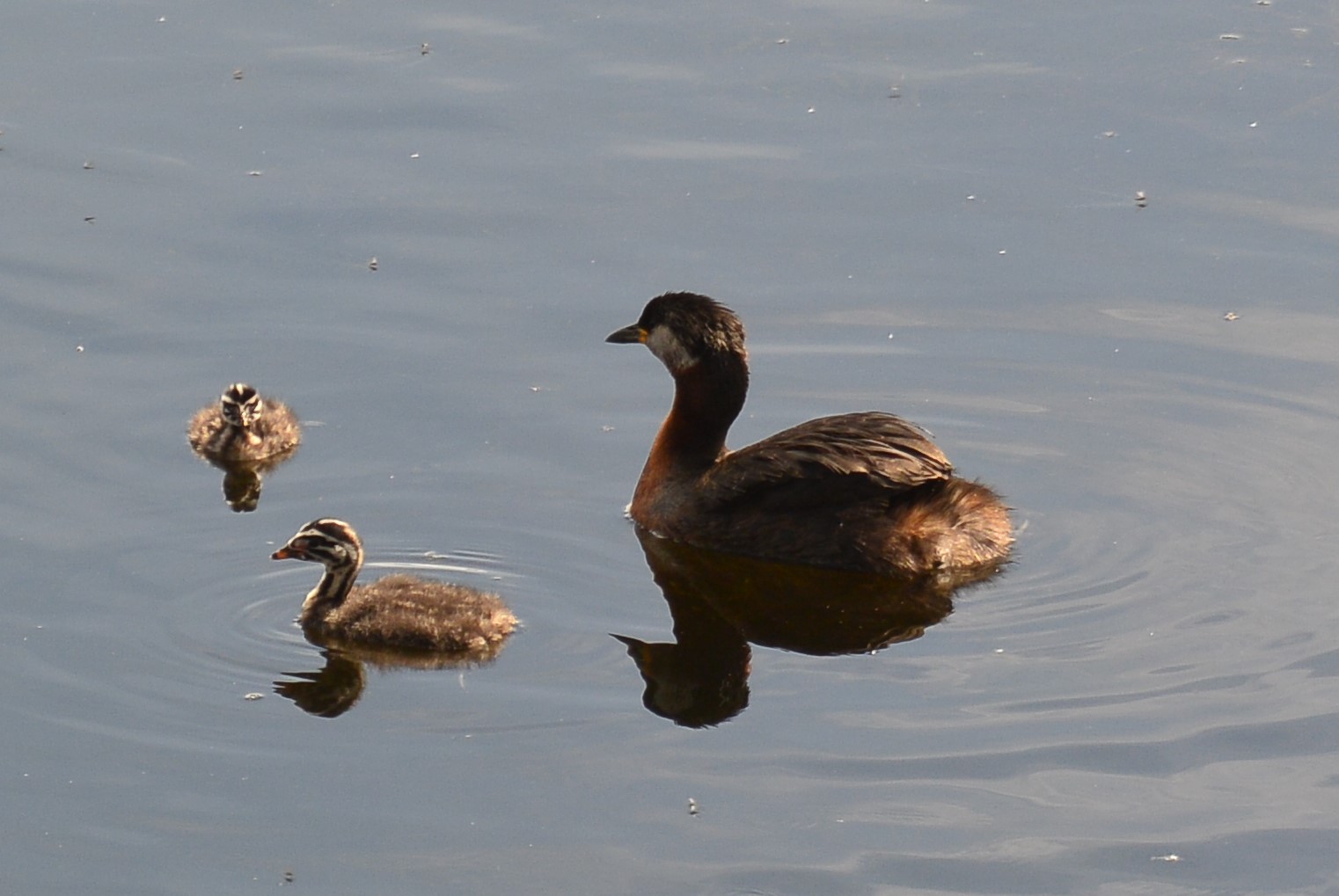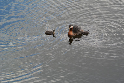 Nåh - jeg kom ned til det lokale fugletårn og der kunne jeg høre både Rørsangere og Nattergal (2 stk.). Hørte senere Nattergal andre steder i mosen. Lige nedenfor lå der et par Gråstrubet Lappedykkere med 2 unger; der har været 3 så vidt jeg har hørt. Det her pars unger var en del forskellige i størrelse, som det kan ses på billederne herunder. Den store af dem snuppede alle den føde (små-fisk) som forældrefuglene fangede. Den lille fik ikke noget, mens jeg så det.....var der ca. 1 times tid. Den dør nok af sult en af dagene. That's life. På det første og det tredje billede kan man se størrelsesforskellen. Bemærk også ungernes sort/hvide striber i ansigtet.
