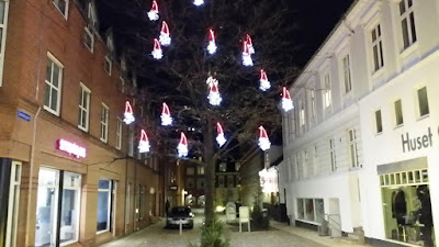 Som alle andre byer, er også Esbjerg hyldet i jule-udsmykning. Deres gå-gade er faktisk ret pæn her om aftenen; det er ikke bare hvid/gule lys, de er i forskellige farver, hvilket desværre ikke kan ses af de dårlige mobilkamera optagelser jeg her har lavet herunder: