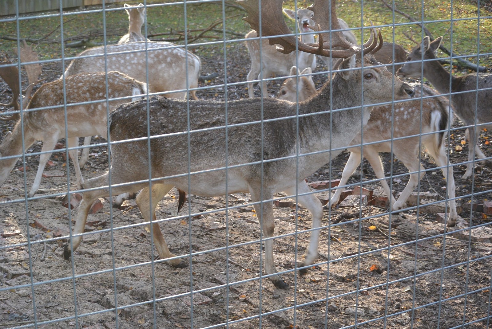 Hvad der også er her - udover endnu en rideskole (der er vist 5 i kommunen og den ene kan man se på luftfotoet for oven syd for Mosehullerne) - er en Hjortefarm med Dådyr. Jeg har vist tidligere nævnt den. Herunder et foto fra lågen ind til farmen. På et skilt står der, at man gerne må fodre dyrene med æbler og gulerødder. Jeg havde ellers forståelsen af at de ikke måtte fodres, men det er godt at få sådan noget afklaret. Billedet herunder er taget med det mindste min telelinse kan klare, derfor ret nærbilledeagtigt.