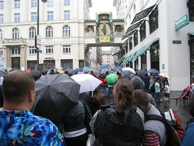 Nedenfor ses det berømte Anker-ur, som når klokken er 12 har et helt galleri af historiske figurer passerende foran urskiven i langsom bevægelse. Det var en af 2 småregnvejrsdage den dag.