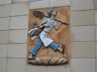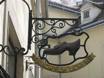 Hvad der er meget af rundt omkring er skilte for de enkelt fag (forretninger). Herunder en bager og en skomager.