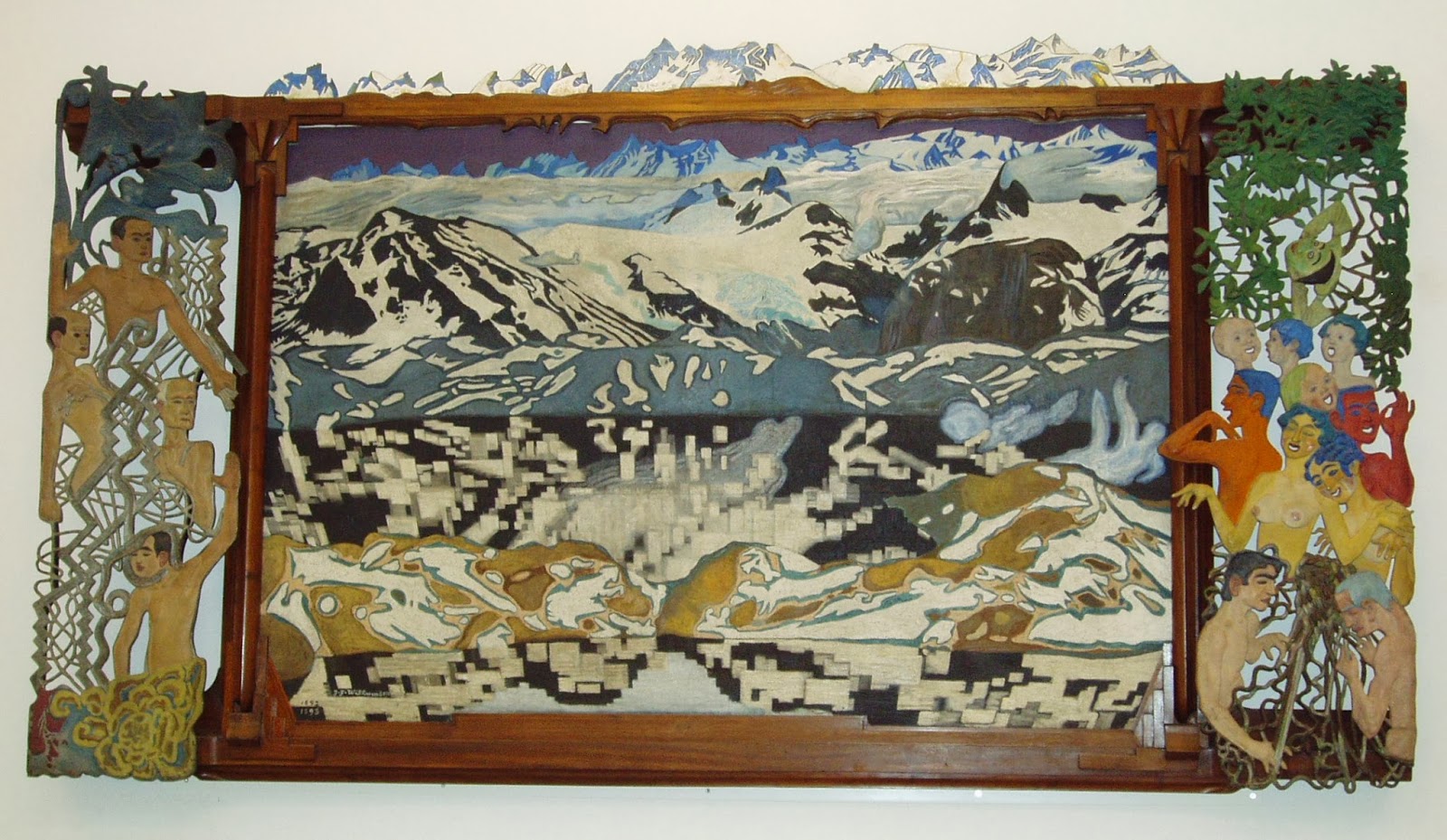 Nedenfor er et af de "malerier" jeg altid dvæler ved: Jotunheimen. Den viste yder slet ikke originalen retfærdighed. Det er en blanding af maleri og skulptur, idet relieferne i rammen er lavet af Zinck og så bemalet. Den øverste takkede kant/ramme er hele Jotunhem-massivet i profil i zinck. Samme profil er malet i maleriet øverste del. Et fantastisk stykke.