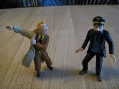 Og et andet sted passerede vi en stand for Forlaget Interpresse ( ? ? ) som bl.a. udgiver - mener jeg - TinTin bøgerne og her havde de "udsalg" på al merchandise omkring TinTin, så der faldt jeg for de 2 nedenstående ca. 10 cm høje plastic-figurer af TinTin og Kaptajn Haddock. Hvem kan stå for dem, vel ?