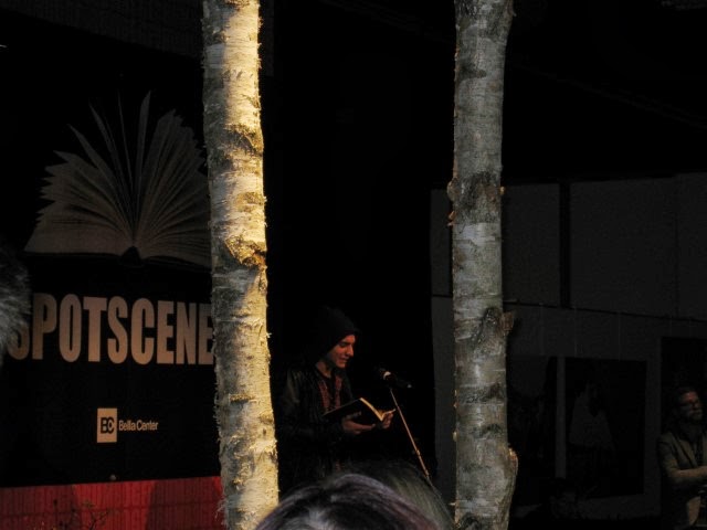For resten havde vi lige efter vi kom ind passeret en scene, hvor den unge digter Yayah Hassan stod og læste op af sine digte på den for ham ( og også for andre 2.g danskere) noget hakkende, staccato måde at gøre det på. Tit tænker jeg - og nogen gange siger jeg det til dem - at I siger danske ord, hvorfor siger I dem så ikke på dansk ? Hvorfor på den der staccato-måde-med-ordene-lige-ud-og-efter-hinanden-sammenhængende-måde-i-det-her-lidt-høje-hæse-tonefald ? Nåh - det var et sidespring; der var fuldstændig fyldt omkring den scene hvor han var.