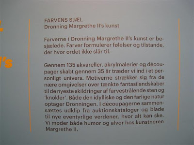 Lige når man ankommer til de sale, der huser Dronningens kunst, så mødes man af denne gevaldige fotostat af hende igang med noget decoupage-halløj. Lige under hendes højre arm, den nederste, står der en plastic-flaske, hvor der på etikketten er trykt "Royal finish"......(det er lak til at påføre decoupagerne med, så de skinner og bliver holdbare)......så er stilen ligesom lagt, ik' ?
