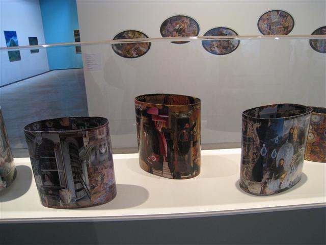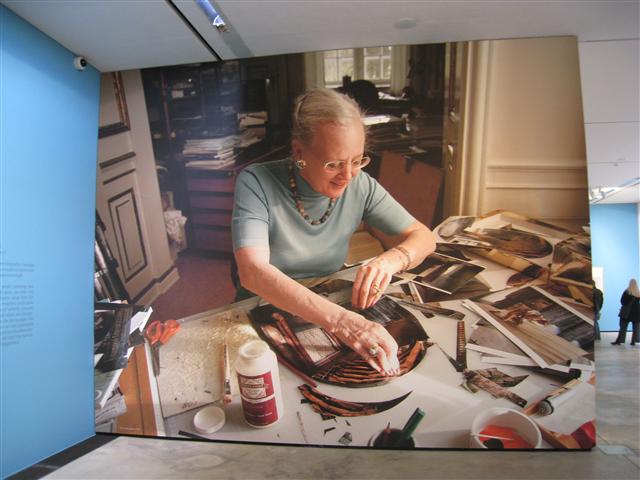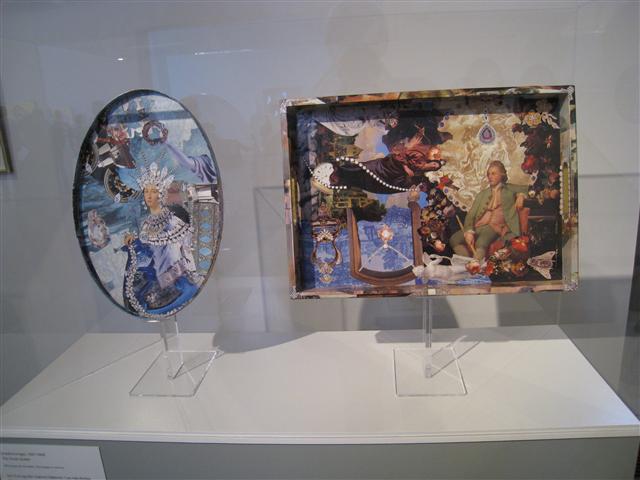 Og så er der hendes "Decoupager". Det er papirklip...altså en masse ting hun har klippet ud fra kataloger, blade o.s.v. og så klistret på plader, bakker, papirkurve o.s.v. Jeg må sige, at hun må have en ganske sikker hånd og en spids og skarp saks, for meget af det er sandeligt virkeligt småt eller detaljeret. Jeg synes de er spændende på en måde, men så heller ikke mere. Der er - efter min mening - FOR mange ting samlet på en ting. Måske misser jeg pointen eller historien ved dem. Jeg har tidligere set andre decoupager af hende, som ikke har været så detaljerede. Og hvilket får mig til at tænke på Kamma Rahbek, der levede omkring år 1800, og hendes decoupager, som man kan se et par stykker af på Bakkehusmuseet på Frederiksberg; de er mere enkle, men det skyldes måske nok også, at udbudet af klip-bart materiale dengang var stærkt begrænset. Men herunder ses lidt: