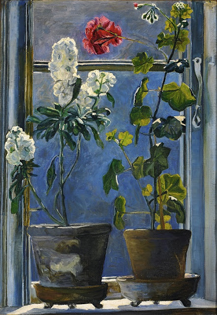 Og jo - der var også en del malerier og akvareller af Alhed Larsen. Jeg synes bestemt at nogen af dem er fine og at hun bestemt er dygtig til blomster maleri som det nedenfor viste (hugget fra nettet) af "Levkøj og Pelargonie" fra ca. 1905 stående i en solbelyst vindueskarm. Jeg synes der er et fandens flot lys i det.