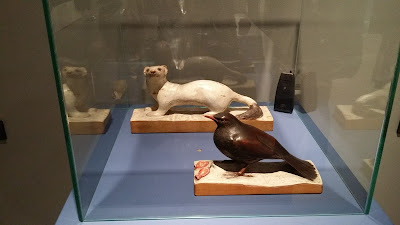 Johannes Larsen var også god med en kniv, for i en montre stod denne Hermelin og Solsort som han har snittet i træ.