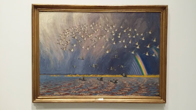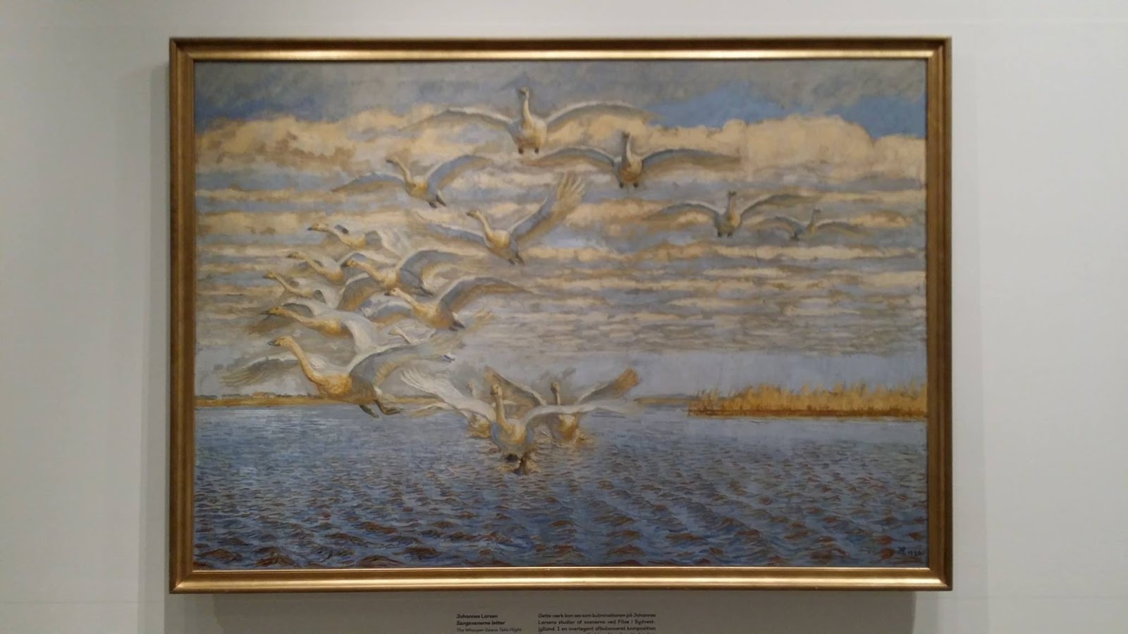 Nedenstående er et kæmpemaleri hedder "Sangsvanerne letter" og er fra Filsø, 1926. Det er 183 x 262 cm og i privateje. Tænk at have vægplads til dette maleri.