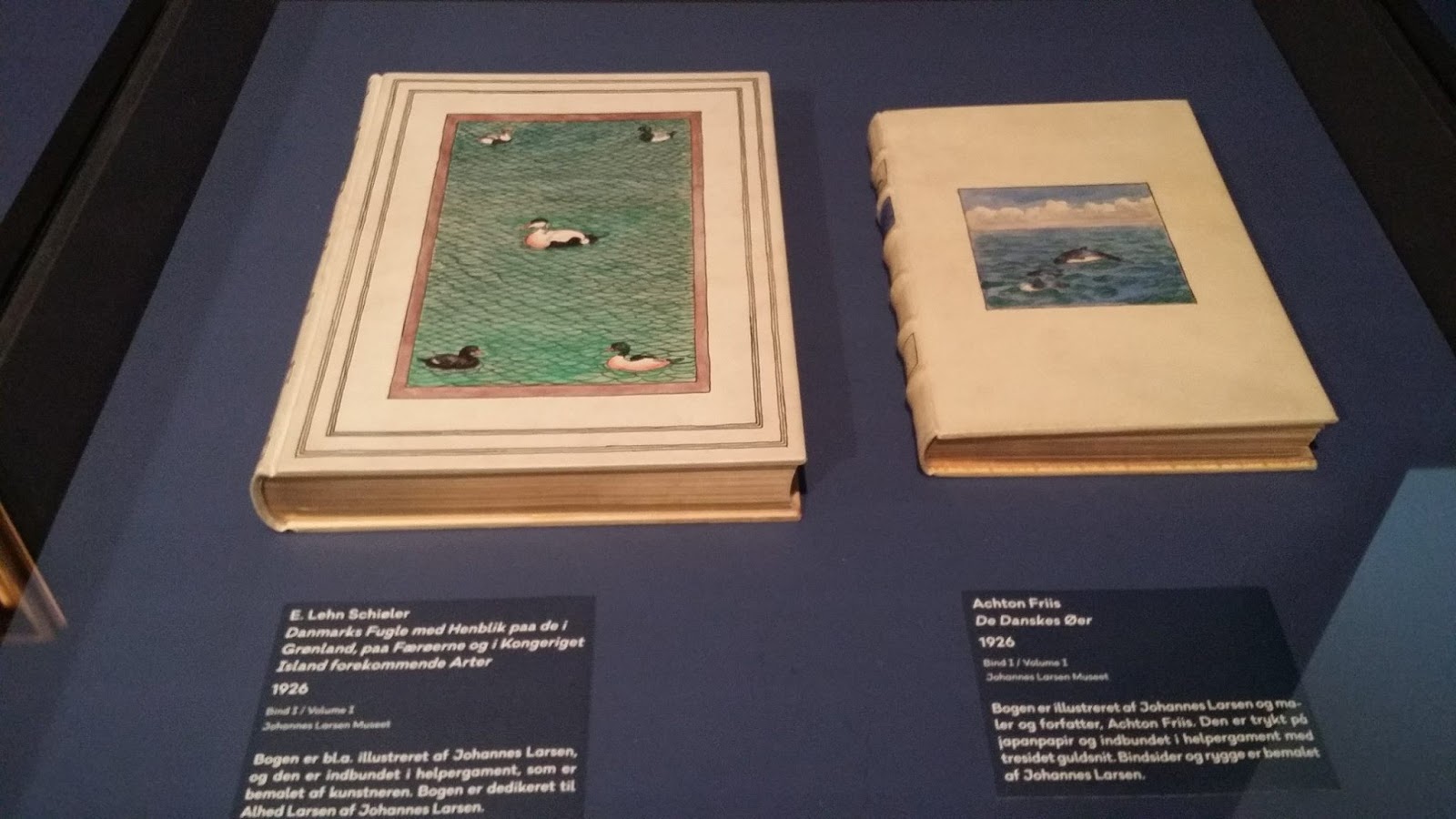 Johannes Larsen var en fantastisk illustrator. Dels i træ-snits faget og dels i tegnings- og akvarel faget. Han illustrerede mange bøger bl.a. skulle han have illustreret E.Lehn Schiøler's fantastiske 5 binds-værk om Danmarks fugle. Der udkom desværre kun 3 bind, idet Lehn Schiøler gik konkurs med sine virksomheder i 1922 (især p.g.a. alt det der Verdensøkonominedgang der skete efter 1.verdenskrig). Et bind af denne ses nedenunder til venstre. Derudover formede Johannes Larsen partnerskab med tegneren/maleren/forfatteren Achton Friis om at illustrere dennes Bøger "De Danske Øer", "De Jyders Land" og "Danmarks store øer" som foregik rundt i landet ved sejlads i Kertemindefiskerbåden "Rylen" og hvormed de gennemrejste/besejlede Danmark gennem flere somre. Et eksemplar af det første bind i "De Danskes Øer" ses nedenunder til højre. Det er nogle herlige bøger; jeg har (desværre kun) 3-bindsværket "De Danskes Øer".