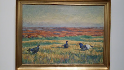 Nu vil jeg gerne springe til et - for mig altså - Highlight på denne udstilling, bare fordi jeg er meget begejstret for lige netop dette maleri. Det forestiller 3 Urfugle (hanner for at være nøjagtig) i parringsspil på (formentlig) Vind Hede i Jylland. Urfuglen er nu uddød i Danmark og det er formentligt nogen af de seneste Johannes Larsen har malet her (som er på 95 x 131 cm og malet i 1941):