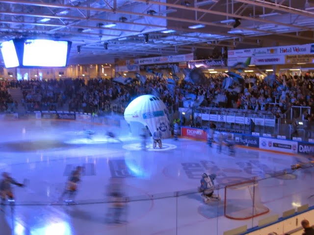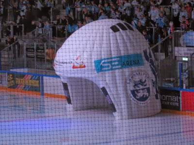 Det endte med meget hurtigt med at blive denne oppustede store ishockeyhjelm. Og ind igennem denne i røg og damp med blinkende lamper og larmende fanfaremusik kom hjemmeholdets spillere nu ind på isen: