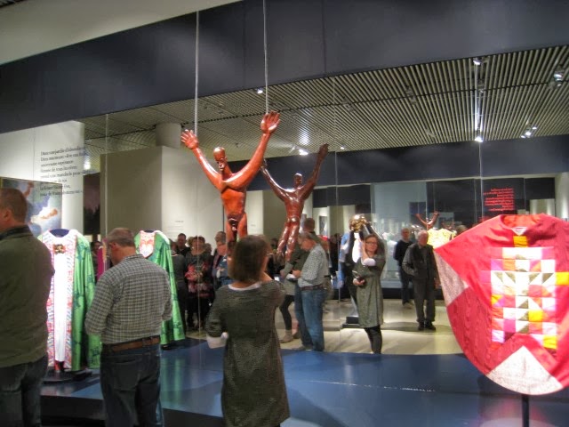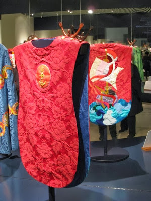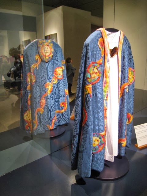 Herefter gik vi tilbage til Bispe-kåberne og så nærmere på dem. Det er virkelig fantasifulde ting. Fyldt med religiøse symboler i sær relaterende til det pågældende stifts skytshalløj. Og det er virkelig håndværk. Hold da op - når man ser nærmere på dem, så kan man se, at det er bittesmå korsstings-broderier. Den måde de er vist på er også god; der er nemlig spejle på væggen bag, så man kan se kåberne og messe-hagelerne bagfra samtidigt.