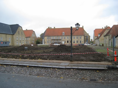 Herunder ses kirkepladsen med den specielle Brødremenighedskirke. Der plejer at være buskadser og græs samt meget høje og gamle træer omkransende pladsen. Nu er alt væk. Dels var de gamle træer blevet FOR store, så de skjulte alt og dels var de blevet syge. Man havde derfor besluttet at fælde dem og total renovere hele pladsen. Samtidig vil man renovere hele gaden fra ende til anden tilbage til oprindelig udseende. Det vil sige, at man vil fælde alle lindetræerne der og plante nye. Man fjerner også asfalten og brolægger hele gaden med sten. Nogen af de omkringliggende Brødremenighedshuse får også en overhaling og om et års tid skulle det hele være færdigt.