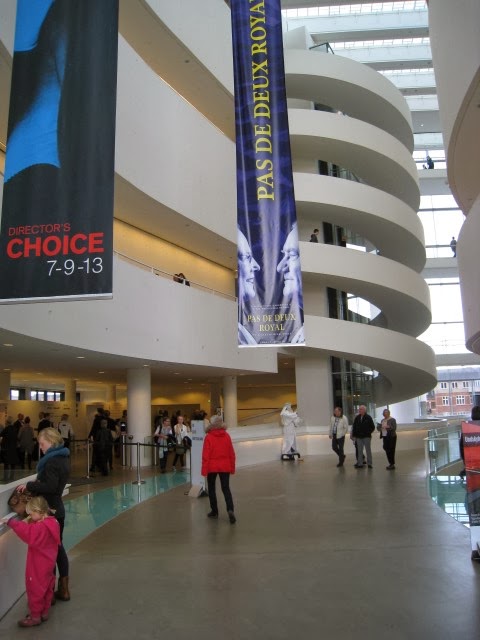 ....og indenfor det Guggenheim-Museum inspirerede trappe-tårn. Flot er det i hvert fald. Det er Lillemor i den røde jakke.