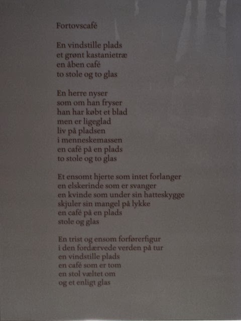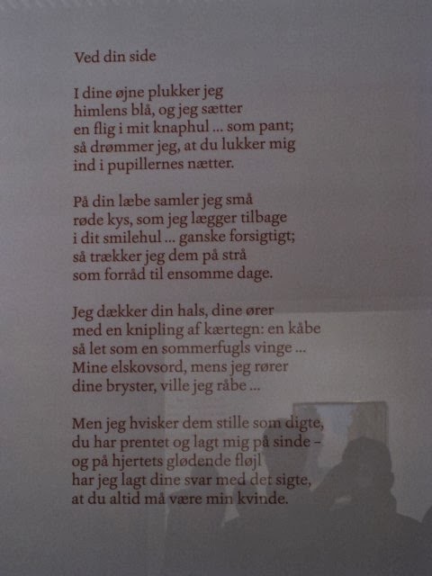 I dette rum kunne man høre Prins Henrik læse nogen af sine digte op....på dvd forståes. Og digtsamlingerne var udstillet. Der var også 9 kæmpestore "plancher" med nogle af hans digte, som man kunne læse. Det ene, der er vist nedenfor og som jeg håber I kan læse, er ret godt i sin stemning, dog måske lidt naiv i sine "remser":