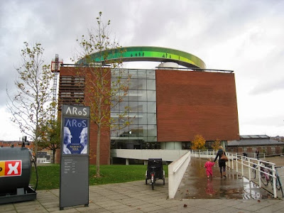 Her ses Aros med Olafur Eliassons installation på taget. Man kan lige ane nogen gæster gå rundt oppe i den. Den er simpelthen en oplevelse og bør besøges af jer, der læser dette her. I øvrigt åbner de noget cafe-halløj af en slags deroppe her d. 16. November.