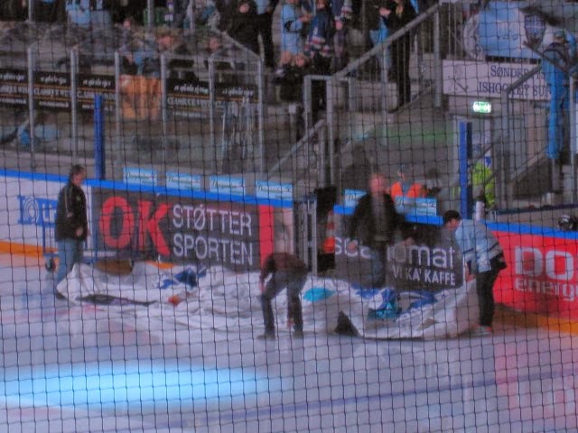 Da vi var kommet ind og havde fundet vores pladser, så kom nogen mænd ind på isen med en trækvogn med "noget stort" på, som de rullede ud og begyndte at pumpe op foran spillerindgangen.