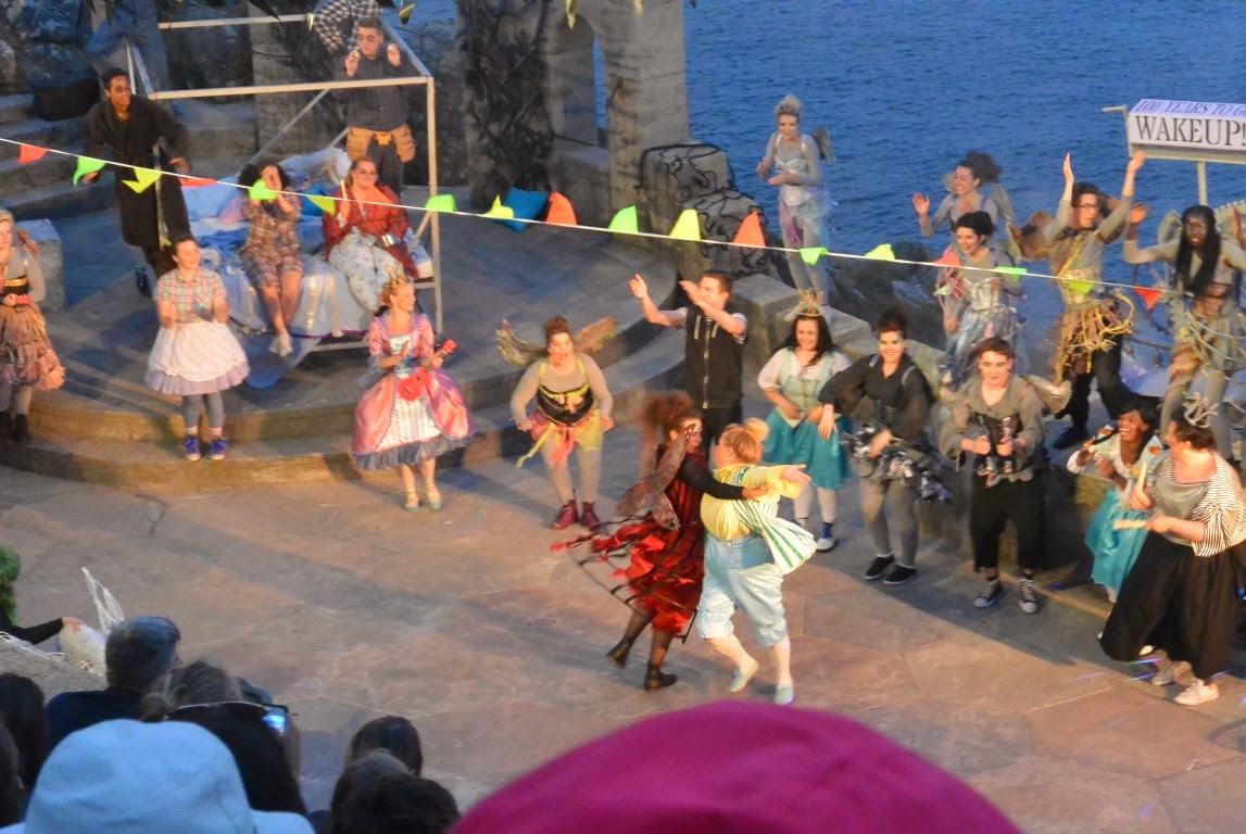 Ca. 10-15 minutter før forestillingen begyndte kom et par af skuespillerne frem på trapperne og hilste hjerteligt på folk. Først troede vi, at de hilste på fremmødte familiemedlemmer, venner og bekendte, men så gik det op for os, at de bare lavede gas med os...sådan ligesom at få folk op i humør og stemning. Fyren her under spillede en alf (Fairy) i forestillingen. Han havde meget løse håndled om jeg så må sige, men enormt herlig og pragtfuldt spillende.