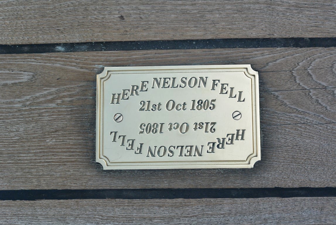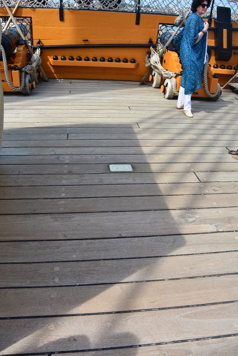 Skibet er jo stadig "aktivt" i den engelske flåde og under kommando af Portmouth's kommanderende Admiral, der bruger skibet en gang imellem til repræsentative formål. Der er altså rigtige flåde personel ombord. Jeg spurgte oppe på dækket en af dem om hvor det var, at Lord Nelson blev ramt og han pegede lakonisk på en lille mesingplade i dækket: