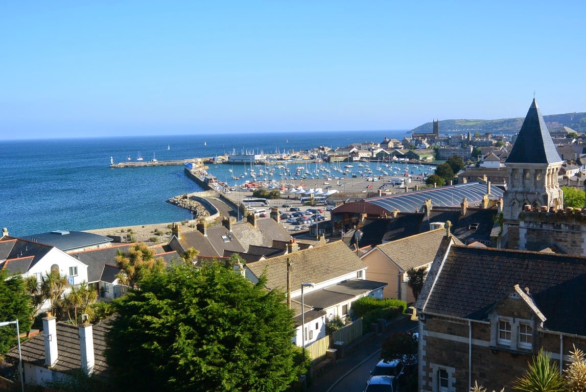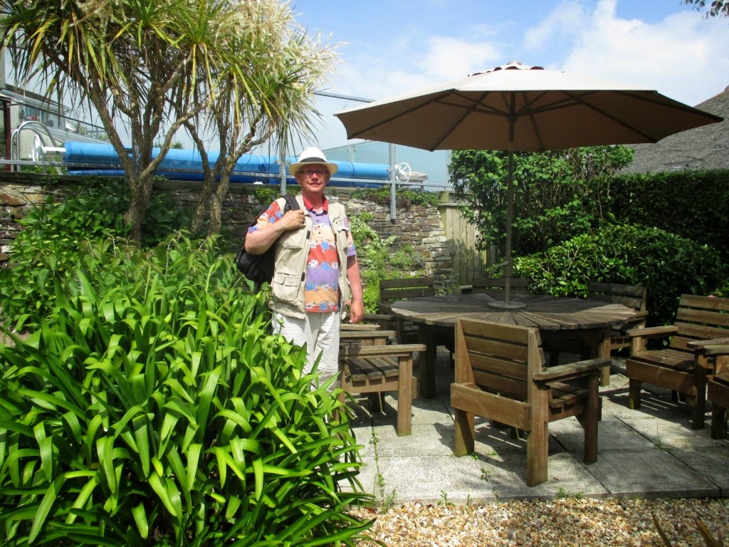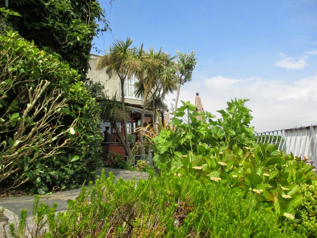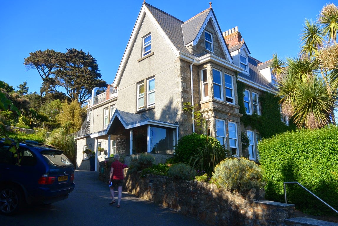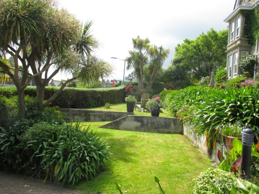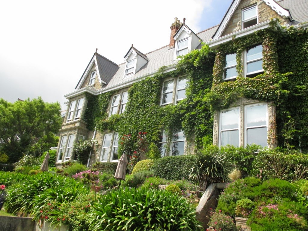 Dagen efter kørte vi så fra Portsmouth og de par hundrede kilometer til vores sluthotel i Penzance. Det var strålende vejr - som det har været på hele turen - og i Cornwall, som landskabet hedder, er der helt tropisk med alle mulige slags palmer og andre eksotiske farvestrålende planter, buske og træer. Vores hotel, som ligger på Briton Hill, ses herunder. Vi havde værelse i den karnap der er øverst til venstre. Der var også vindue i gavlen. Vi havde den fedeste udsigt over bugten og over Penzance havn.