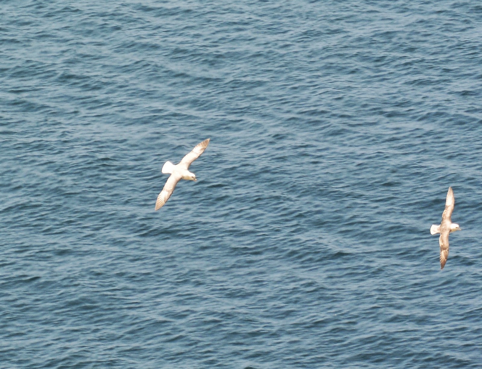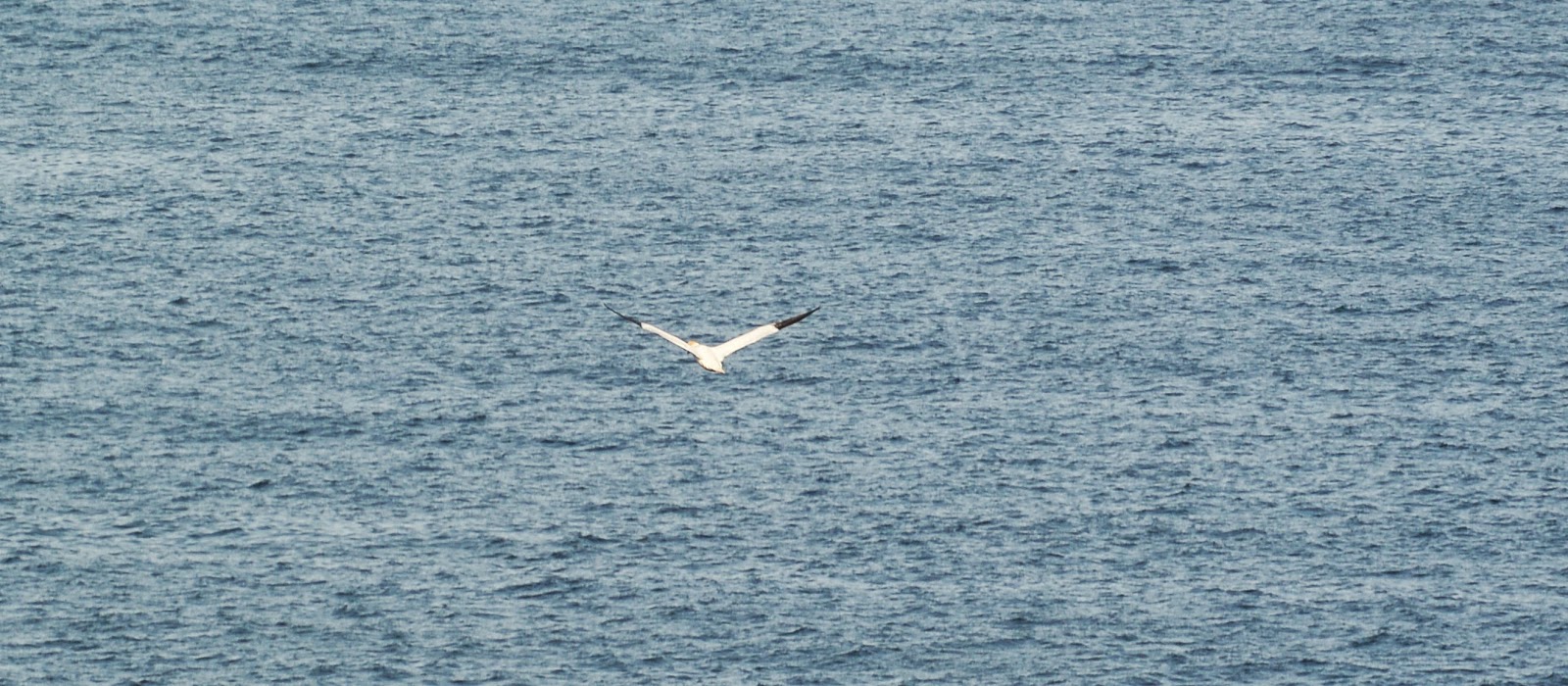 Da vi havde taget plads begyndte vi at spise den medbragte mad....ligesom alle andre også gjorde. Mens vi sad og spiste og kiggede ud over vandet, opdagede jeg at der fløj Mallemukker og Suler rundt. Sulerne, der er nogen store hvide fugle med sorte vingespidser, flyver i 10-20 meters højde over vandet og når de ser en fisk styrtdykker de lodret ned i vandet efter fiskene. Lige før de rammer vandoverfladen samler de vingerne. De ryger flere meter under vand på den måde. Det er og var fascinerende at sidde og se på. Herunder ses en Sule flyve væk fra os: