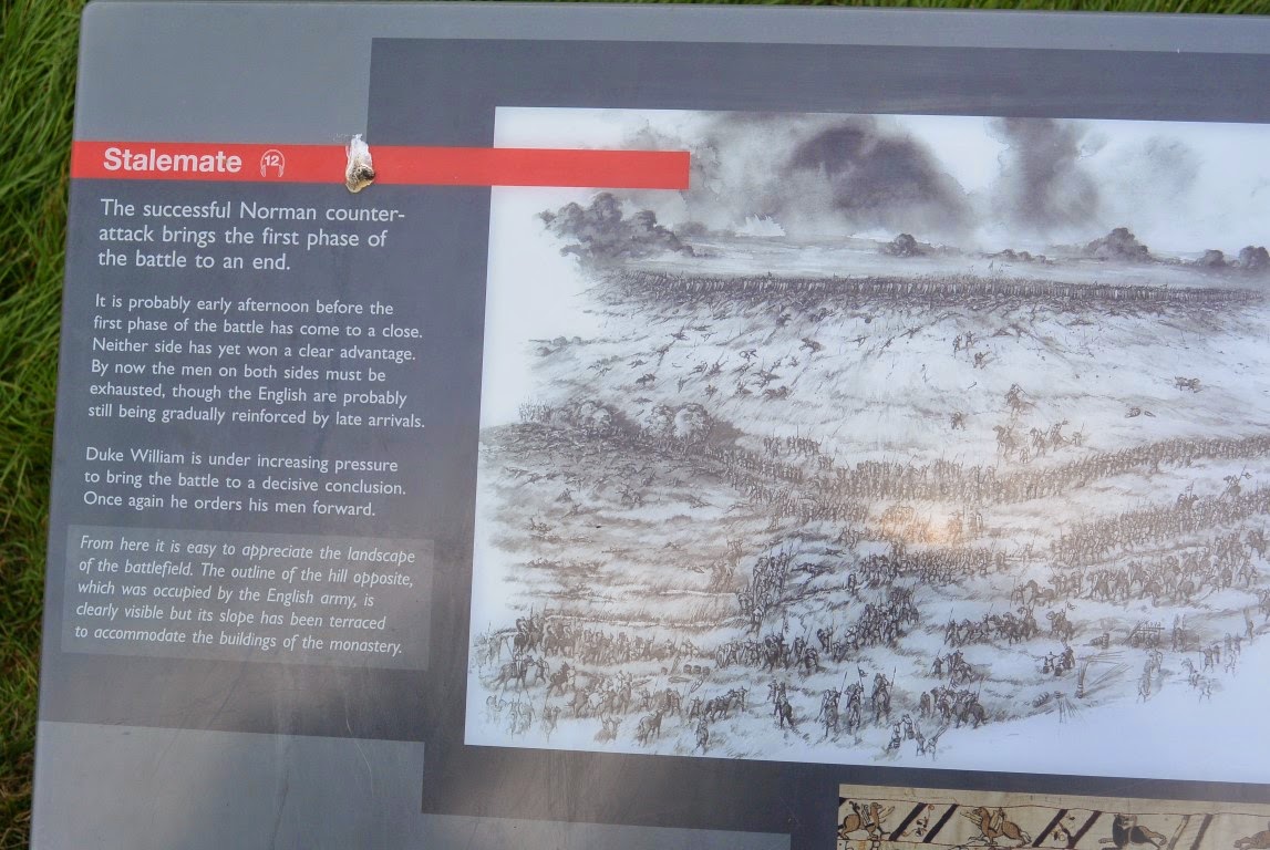 Selve slagmarken er ikke større end at man kan gå omkring den på ca. 45 minutter. Dengang fandtes ingen træer eller buske. Englænderne havde taget placering på toppen af en lang skråning og beherskede således slagmarken. Vilhelm Erobrerens normannere (i øvrigt sjovt at tænke på, at de faktisk var vikinger eller i det mindste 2. generations vikinger bosat i Frankrig) måtte således angribe op ad den lange skråning og det lykkedes længe englænderne at holde stand men måtte til sidst give op og flygte da deres konge Harold blev dræbt. På 2 af billederne herunder kan man se den ret bratte stigning de angreb op ad. I midten af billederne kan man se resterne af kolsteret, der blev opført der hvor englænderne stod i starten af slaget.