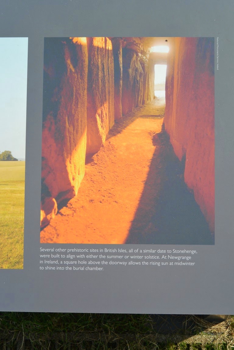 Der var Informationstavler hist og pist. På en af dem nævnes og sammenlignes over til en kæmpe Gravkammerhøj i Irland ved navn Newgrange, hvor solens stråler ved midvinter passerer gennem et hul over døren og når helt ind i gravkammeret inde i midten af højen. Sjovt. Der har vi også været, altså ved og inden i Newgrange kæmpehøjen der ovre i Irland for et par år siden. Billedet herunder er fra den Informationstavle: