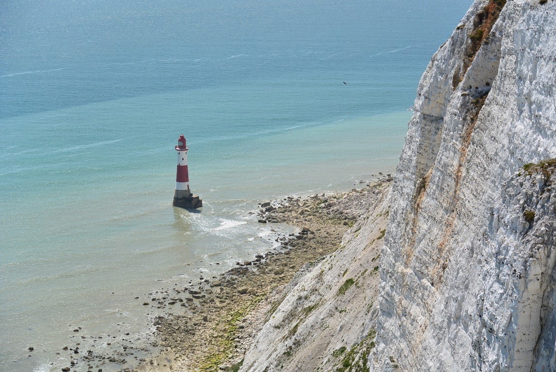 Der er mange fyrtårne ved den engelske kyst. Det nedenfor er nok 30-40 meter højt og giver en ide klintens højde, som jeg fotografere fra: